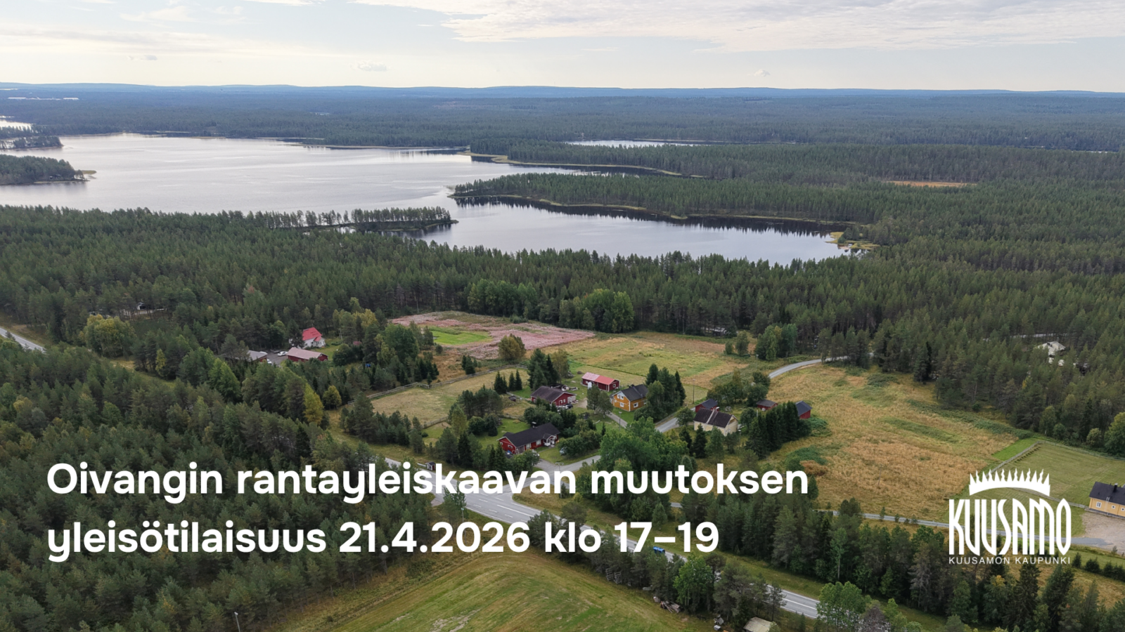 Kuusamon kaupunki järjestää Oivangin rantayleiskaavan muutoksen yleisötilaisuuden tiistaina 21.4.2026 klo 17.00–19.00 Kuusamon kaupungintalon valtuustosalissa sekä Teamsin välityksellä. Kaikille avoimessa yleisötilaisuudessa esitellään parhaillaan nähtävillä olevaa kaavaluonnosta.